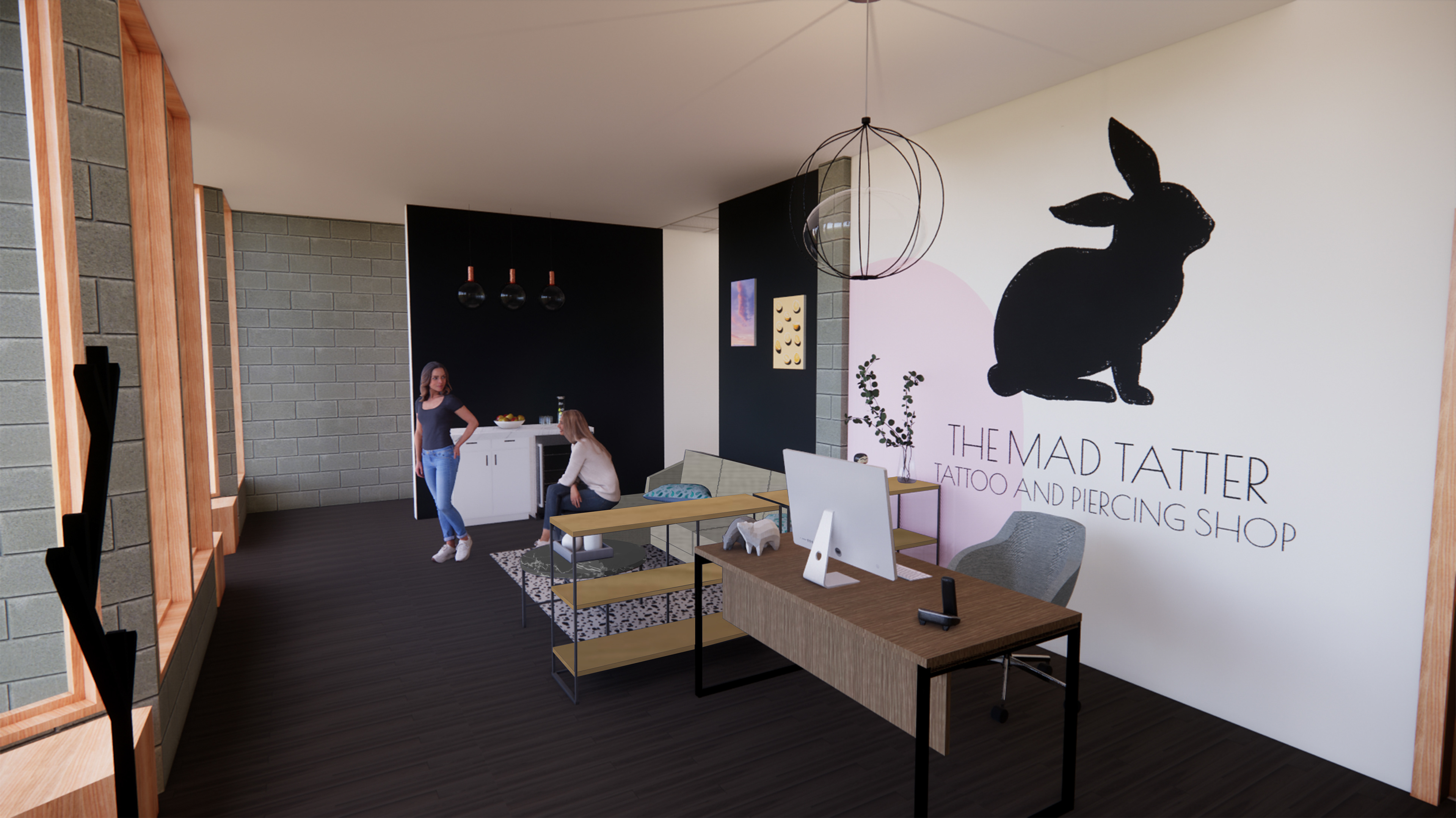 The Mad Tatter is a women-and-LGBTQIA+-owned tattoo and piercing studio located in Minneapolis' Warehouse District. The owner wants to remodel the existing studio and add a private apartment on the upper floors. The overall concept for the studio makes clients feel welcome and safe, which is supported through soft tones and textures. The upper-level apartment achieves a cozy and eclectic feel via the integration of textural variety and a warm color palette.